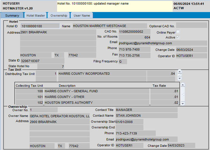 Viewing and Changing Hotel Master and Owner Info