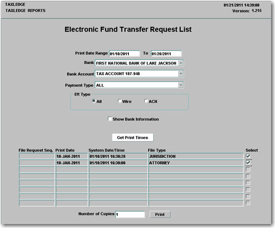 EFT Request report screen