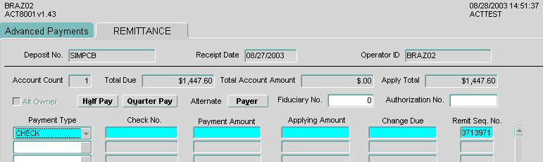 Payment Remittance Screen with Half and Quarter Pay Buttons